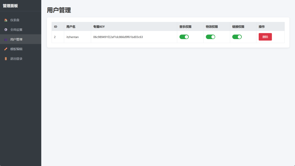 3、权限控制:后台可以精细化管理每个用户。看谁不爽?直接把他账号删了,觉得某个用户太跳?可以一键禁止他使用音乐、特效或者生成分享链接的功能。