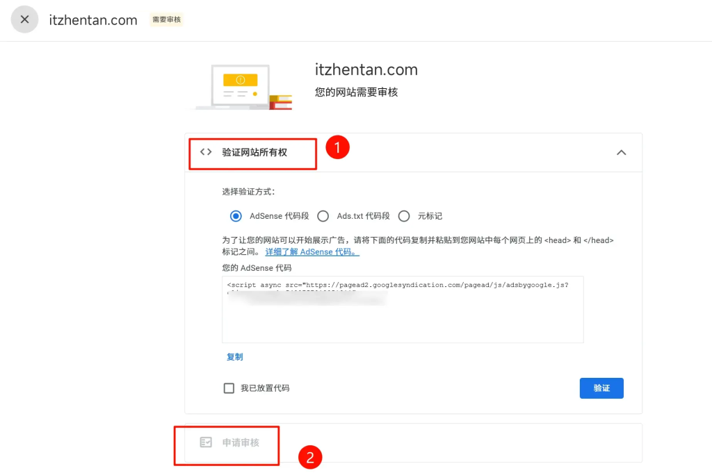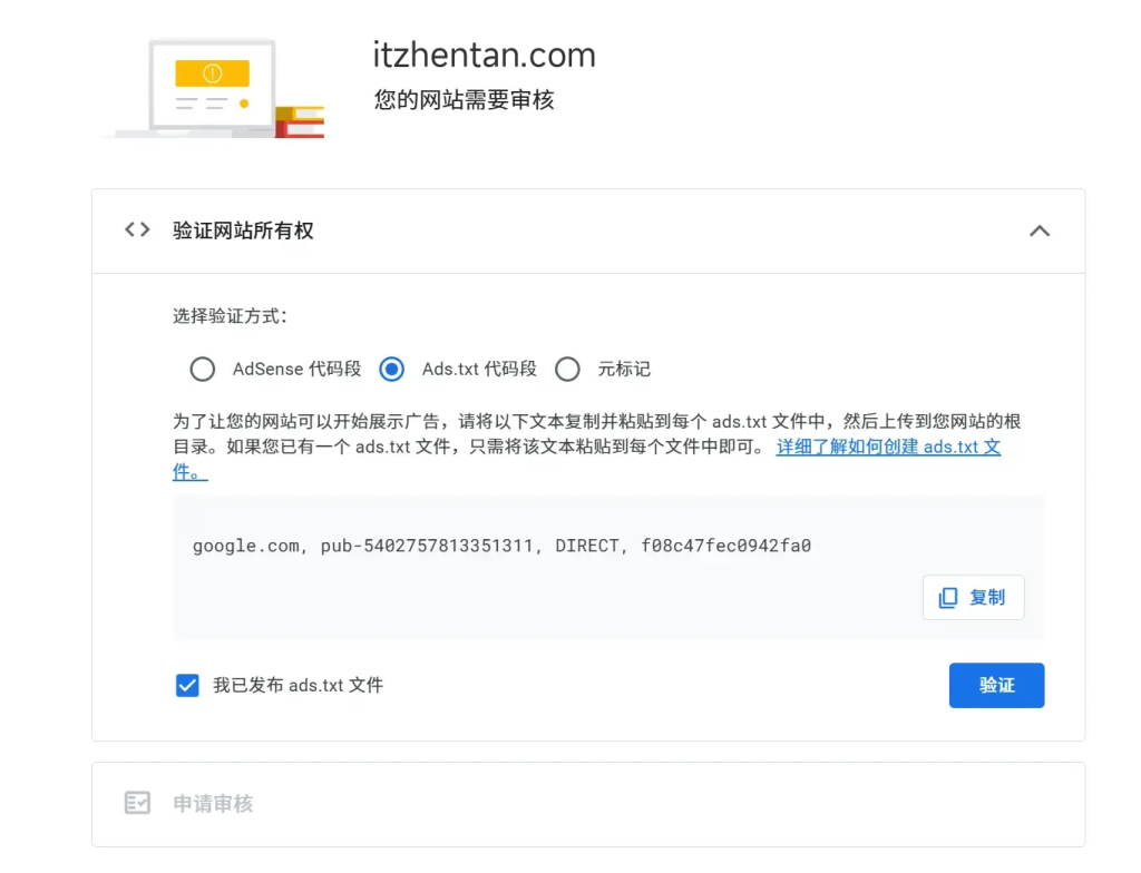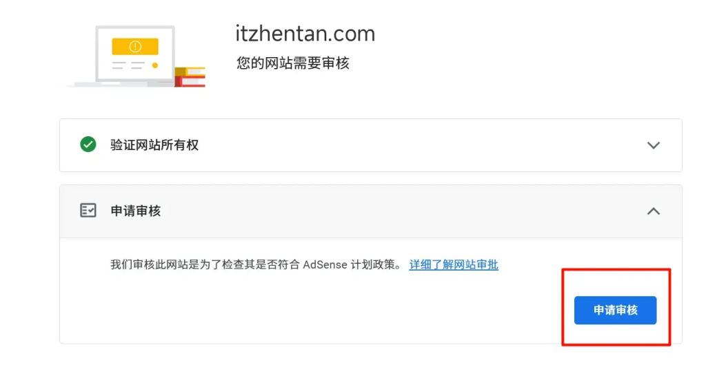 3. 验证成功之后,点击请求审核。这个审核一般会在7个工作日之内审核成功,在这期间建议大家保持正常的网站内容更新。