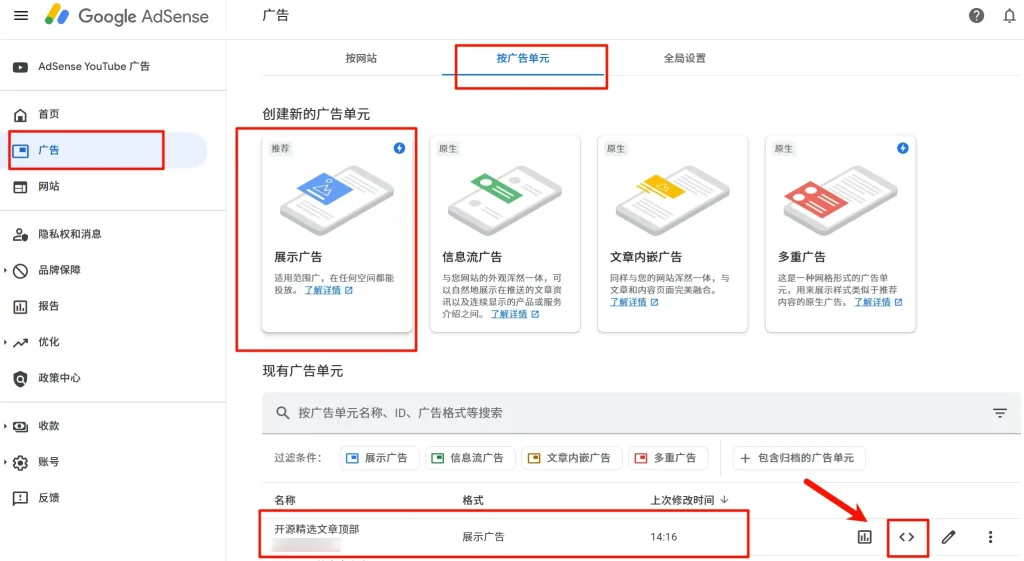 4. 审核成功之后,点击广告、按广告单元、展示广告。来创建广告代码。